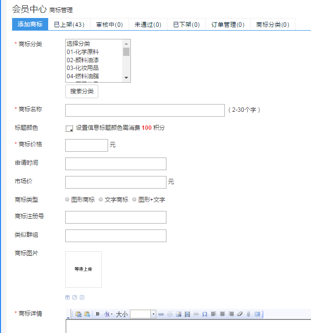 在此頁面可以根據自己實際情況,選擇要發(fā)布的商標信息,包括:商標類別、名稱、價格(包括出售價及市場價,市場價僅供買家參考)、申請時間、類型、注冊號、類似群組、圖片上傳以及簡要的文字說明,確認無誤后即可點擊提交,待我們客服人員審核完畢后,即可在前臺出現,成功上架。